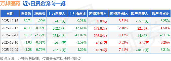 证券之星消息,截至2025年12月15日收盘,万邦医药(301520)报收于39.71元,下跌1.0%,换手率1.91%,成交量4284.0手,成交额1704.44万元。