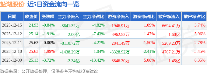 证券之星消息,截至2025年12月15日收盘,盐湖股份(000792)报收于24.93元,下跌0.84%,换手率1.36%,成交量71.9万手,成交额17.92亿元。
