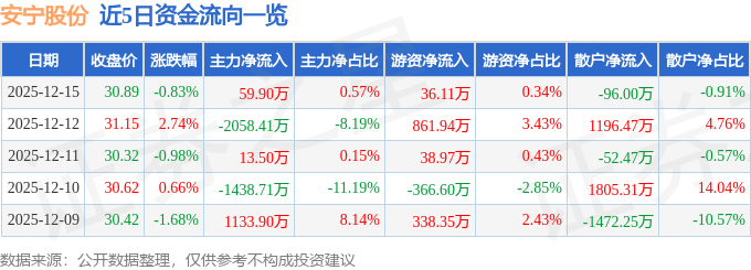证券之星消息,截至2025年12月15日收盘,安宁股份(002978)报收于30.89元,下跌0.83%,换手率0.92%,成交量3.4万手,成交额1.06亿元。
