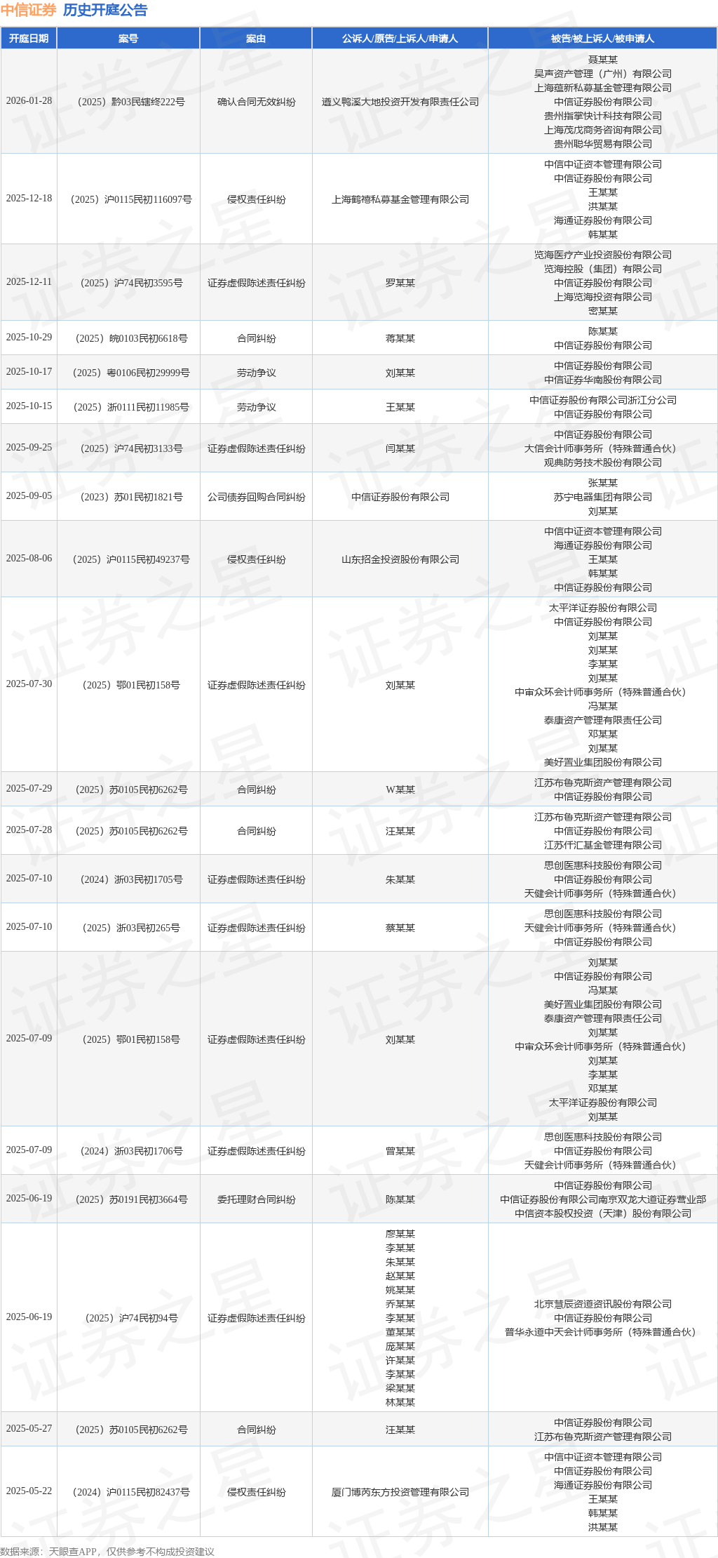案号:(2025)沪0115民初116097号根据统计,近一年内以中信证券股份有限公司为当事人的历史开庭公告有37则,其中案由为“证券虚假陈述责任纠纷”的公告以14则居首,其次为“侵权责任纠纷”有6则,“劳动争议”有5则。历史开庭公告(前20条)如下:
