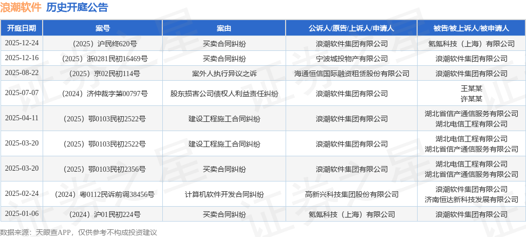 案号:(2025)浙0281民初16469号根据统计,近一年内以浪潮软件集团有限公司为当事人的历史开庭公告有9则,其中案由为“买卖合同纠纷”的公告以4则居首,其次为“建设工程施工合同纠纷”有2则,“案外人执行异议之诉”有1则。历史开庭公告如下: