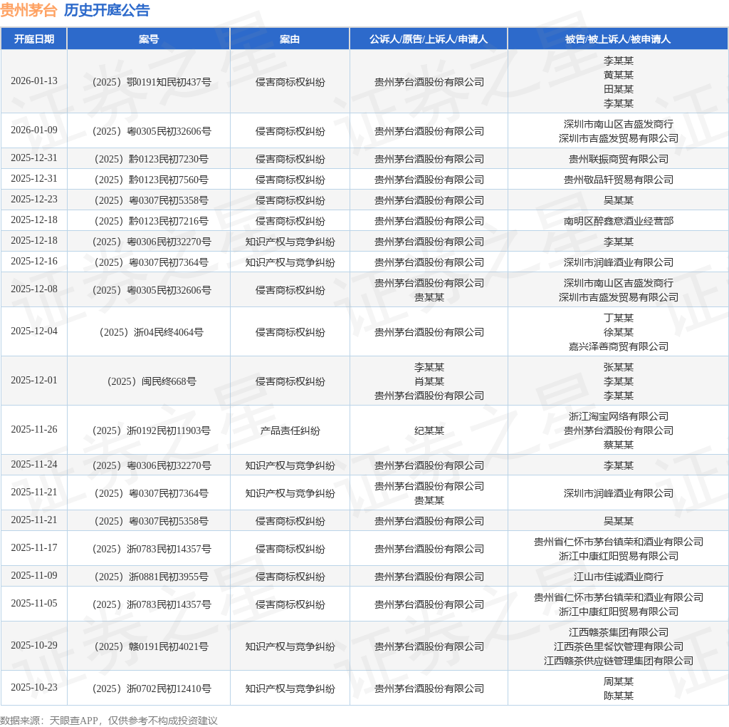 案号:(2025)黔0123民初7216号根据统计,近一年内以贵州茅台酒股份有限公司为当事人的历史开庭公告有188则,其中案由为“侵害商标权纠纷”的公告以134则居首,其次为“商标权权属、侵权纠纷”有16则,“侵害商标权”有9则。历史开庭公告(前20条)如下: