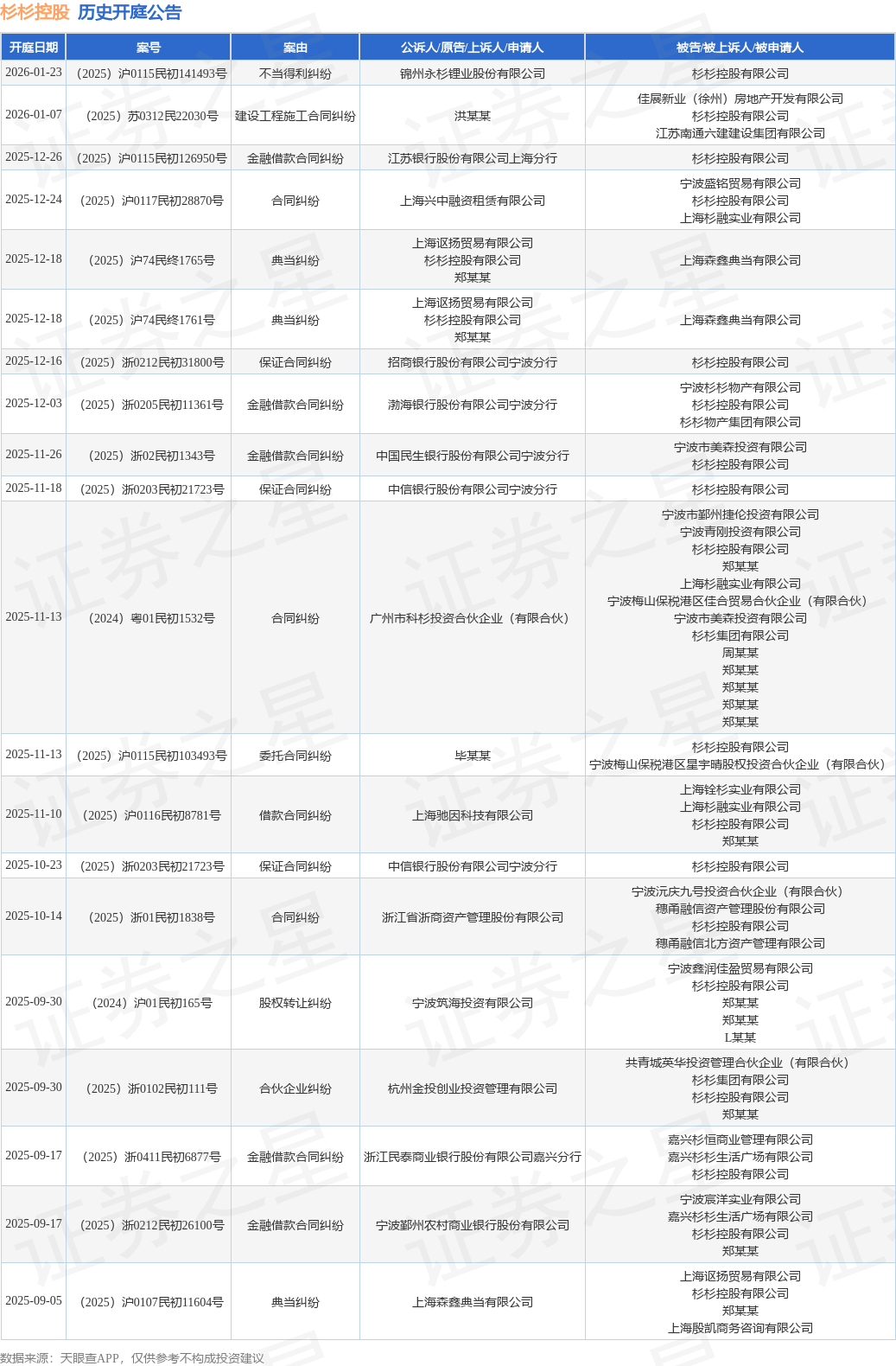 案号:(2025)浙0212民初31800号根据统计,近一年内以杉杉控股有限公司为当事人的历史开庭公告有100则,其中案由为“金融借款合同纠纷”的公告以34则居首,其次为“典当纠纷”有16则,“合同纠纷”有7则。历史开庭公告(前20条)如下: