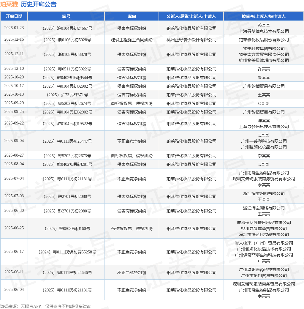 案号:(2025)浙0106民初5028号根据统计,近一年内以珀莱雅化妆品股份有限公司为当事人的历史开庭公告有46则,其中案由为“侵害商标权纠纷”的公告以27则居首,其次为“不正当竞争纠纷”有14则,“商标权权属、侵权纠纷”有2则。历史开庭公告(前20条)如下:
