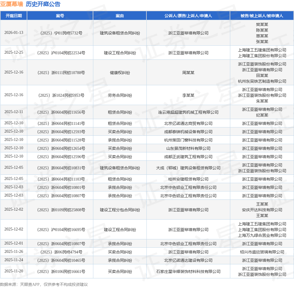 案号:(2025)浙0111民初10788号根据统计,近一年内以浙江亚厦幕墙有限公司为当事人的历史开庭公告有225则,其中案由为“买卖合同纠纷”的公告以40则居首,其次为“建设工程施工合同纠纷”有37则,“建筑设备租赁合同纠纷”有26则。历史开庭公告(前20条)如下: