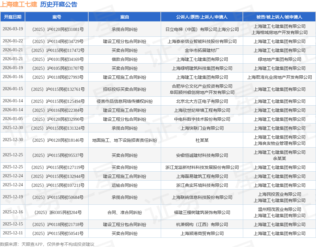 案号:(2025)浙0305民初204号根据统计,近一年内以上海建工七建集团有限公司为当事人的历史开庭公告有215则,其中案由为“建设工程施工合同纠纷”的公告以51则居首,其次为“买卖合同纠纷”有36则,“建设工程分包合同纠纷”有32则。历史开庭公告(前20条)如下: