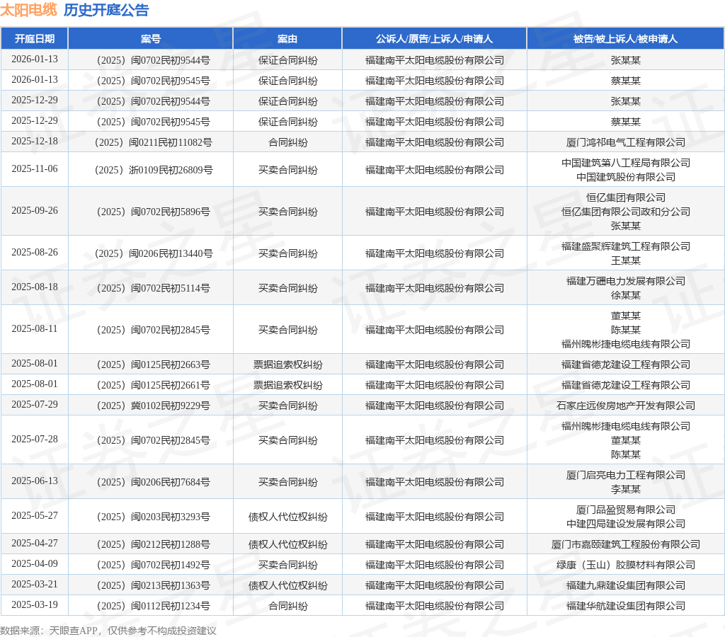 案号:(2025)闽0211民初11082号根据统计,近一年内以福建南平太阳电缆股份有限公司为当事人的历史开庭公告有28则,其中案由为“买卖合同纠纷”的公告以12则居首,其次为“保证合同纠纷”有8则,“债权人代位权纠纷”有4则。历史开庭公告(前20条)如下: