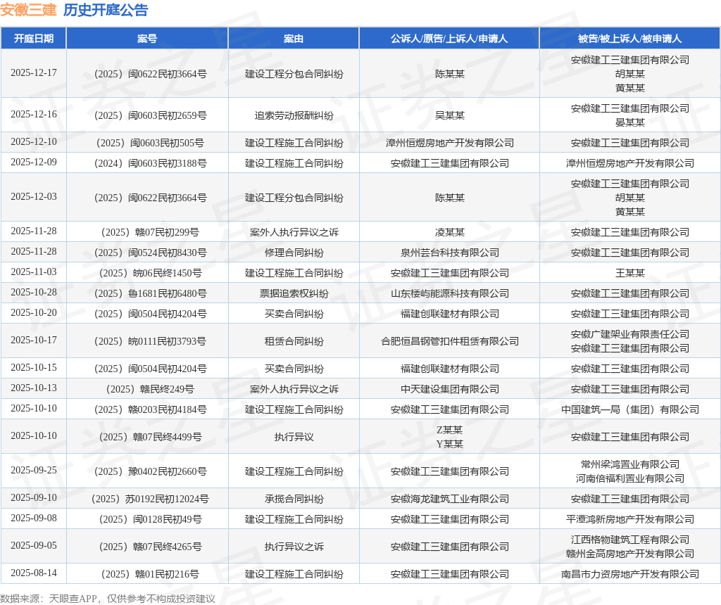 案号:(2025)闽0603民初2659号根据统计,近一年内以安徽建工三建集团有限公司为当事人的历史开庭公告有87则,其中案由为“建设工程施工合同纠纷”的公告以43则居首,其次为“建设工程合同纠纷”有10则,“建设工程分包合同纠纷”有6则。历史开庭公告(前20条)如下: