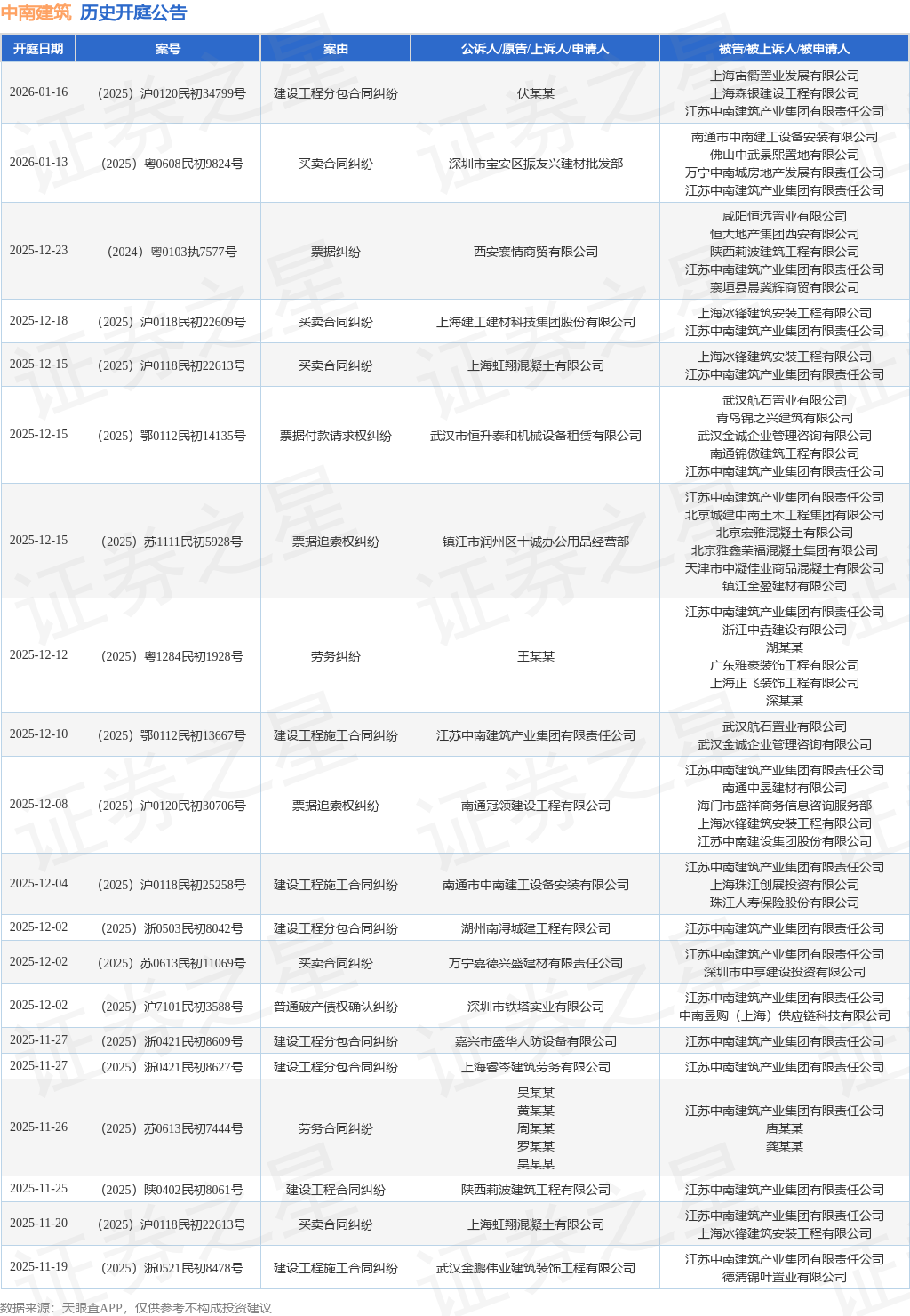 案号:(2025)沪0118民初22609号根据统计,近一年内以江苏中南建筑产业集团有限责任公司为当事人的历史开庭公告有561则,其中案由为“买卖合同纠纷”的公告以104则居首,其次为“建设工程分包合同纠纷”有85则,“建设工程施工合同纠纷”有75则。历史开庭公告(前20条)如下: