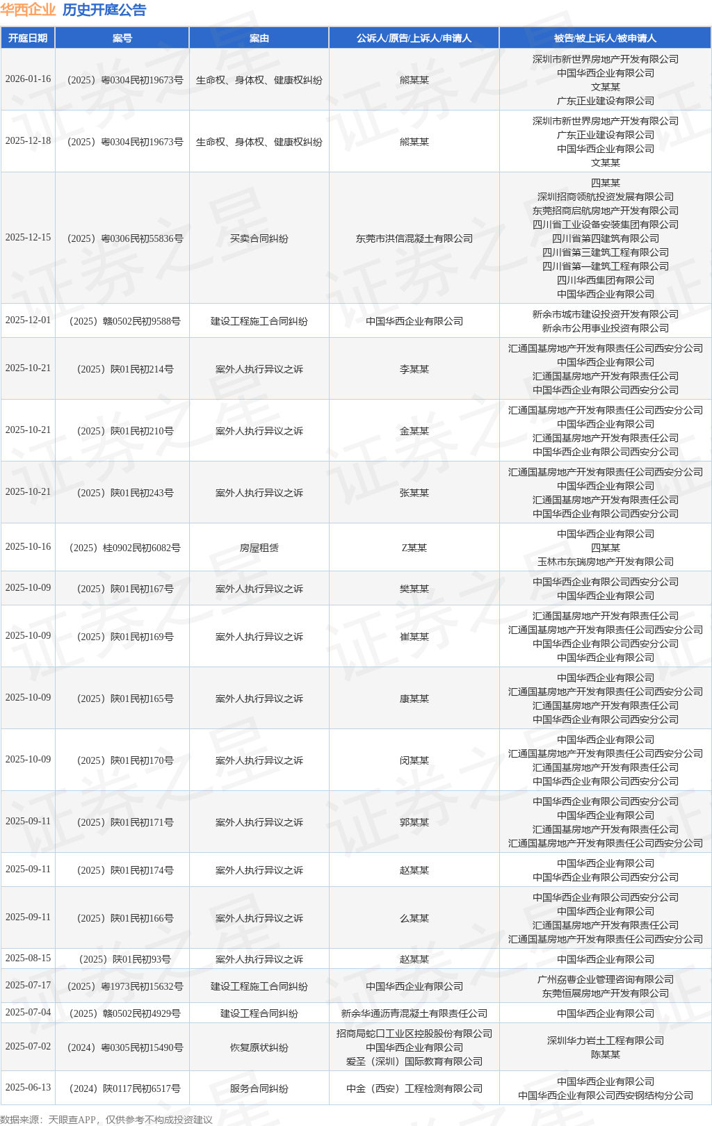 案号:(2025)粤0304民初19673号根据统计,近一年内以中国华西企业有限公司为当事人的历史开庭公告有30则,其中案由为“案外人执行异议之诉”的公告以11则居首,其次为“建设工程合同纠纷”有5则,“建设工程施工合同纠纷”有3则。历史开庭公告(前20条)如下: