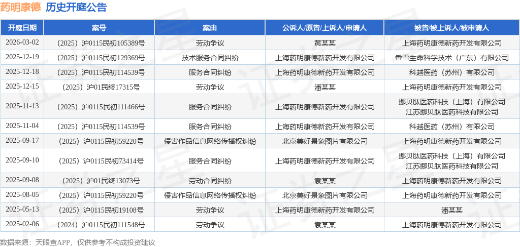 案号:(2025)沪0115民初114539号根据统计,近一年内以上海药明康德新药开发有限公司为当事人的历史开庭公告有12则,其中案由为“劳动争议”的公告以4则居首,其次为“服务合同纠纷”有4则,“侵害作品信息网络传播权纠纷”有2则。历史开庭公告如下: