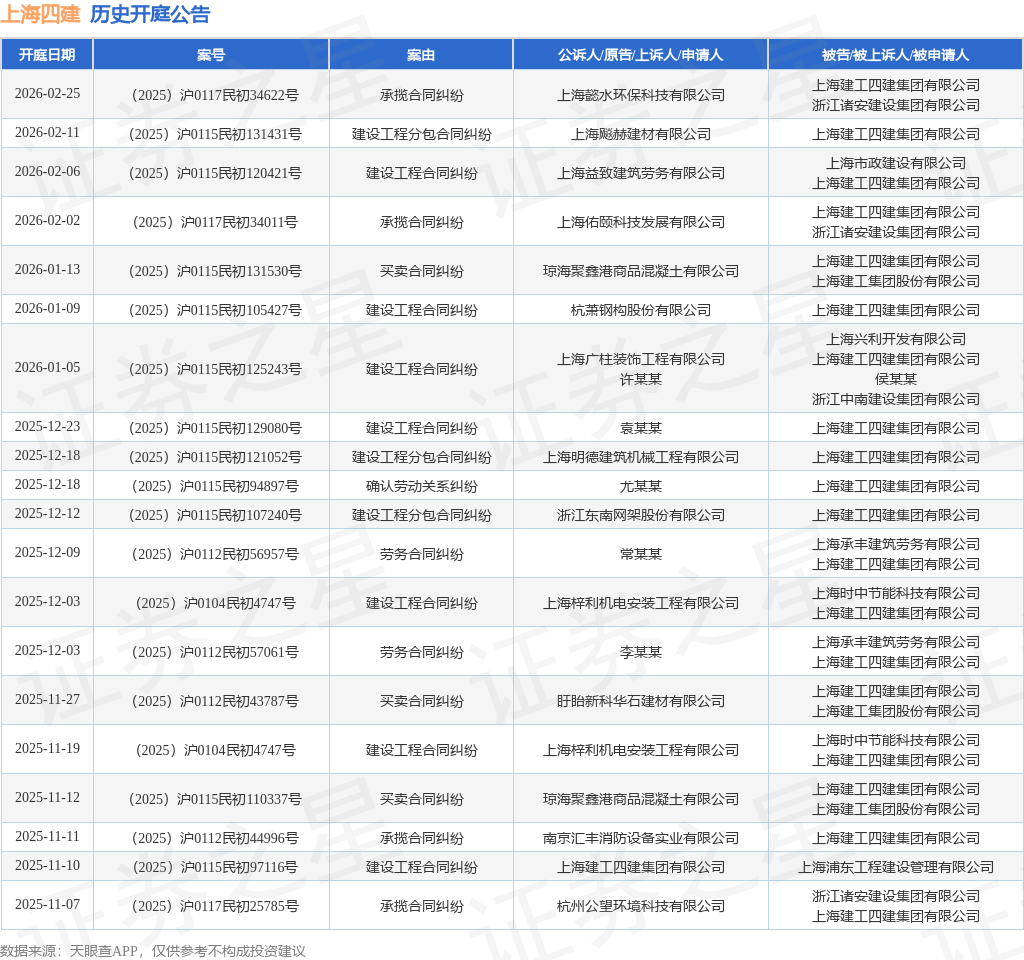 案号:(2025)沪0115民初94897号根据统计,近一年内以上海建工四建集团有限公司为当事人的历史开庭公告有134则,其中案由为“买卖合同纠纷”的公告以29则居首,其次为“建设工程分包合同纠纷”有24则,“建设工程合同纠纷”有15则。历史开庭公告(前20条)如下:
