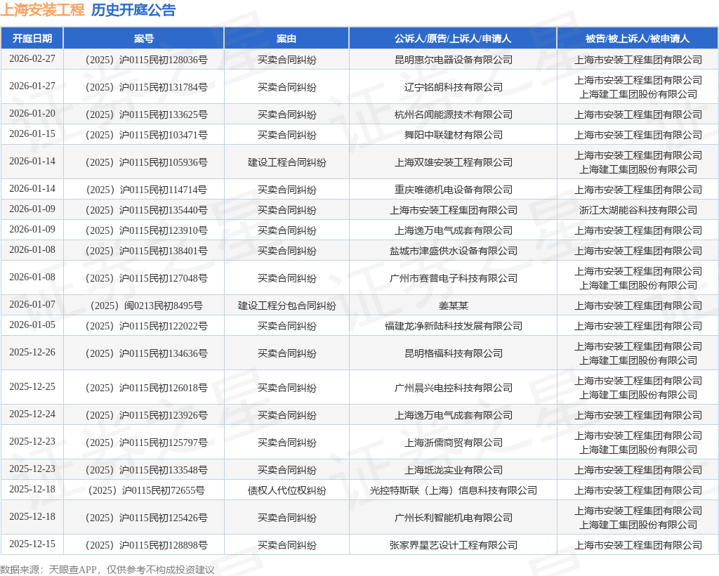 案号:(2025)沪0115民初125426号根据统计,近一年内以上海市安装工程集团有限公司为当事人的历史开庭公告有191则,其中案由为“买卖合同纠纷”的公告以118则居首,其次为“建设工程施工合同纠纷”有26则,“建设工程分包合同纠纷”有10则。历史开庭公告(前20条)如下: