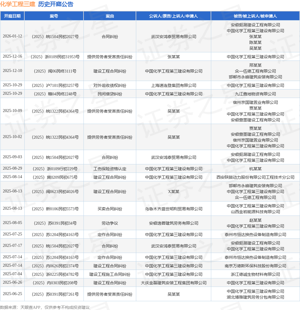 案号:(2025)浙0109民初31953号根据统计,近一年内以中国化学工程第三建设有限公司为当事人的历史开庭公告有51则,其中案由为“建设工程合同纠纷”的公告以11则居首,其次为“劳动争议”有7则,“建设工程施工合同纠纷”有7则。历史开庭公告(前20条)如下:
