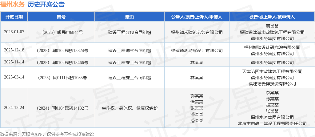 案号:(2025)闽0102民初15824号根据统计,近一年内以福州水务集团有限公司为当事人的历史开庭公告有5则,其中案由为“建设工程施工合同纠纷”的公告以2则居首,其次为“建设工程分包合同纠纷”有1则,“建设工程勘察合同纠纷”有1则。历史开庭公告如下: