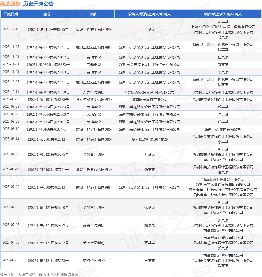 案号:(2025)沪0117民初6275号根据统计,近一年内以深圳市美芝装饰设计工程股份有限公司为当事人的历史开庭公告有41则,其中案由为“劳务合同纠纷”的公告以10则居首,其次为“劳动争议”有7则,“建设工程分包合同纠纷”有7则。历史开庭公告(前20条)如下: