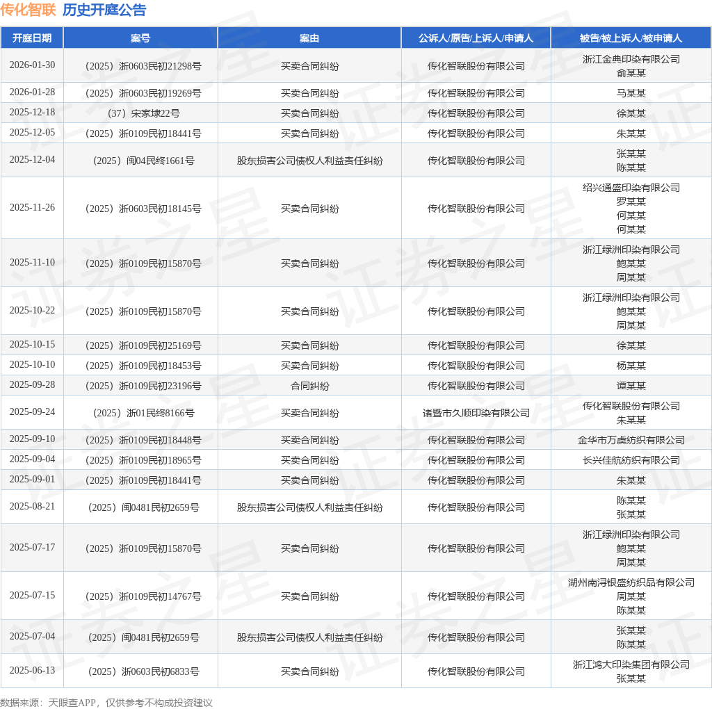 案号:(37)宋家埭22号根据统计,近一年内以传化智联股份有限公司为当事人的历史开庭公告有28则,其中案由为“买卖合同纠纷”的公告以24则居首,其次为“股东损害公司债权人利益责任纠纷”有3则,“合同纠纷”有1则。历史开庭公告(前20条)如下: