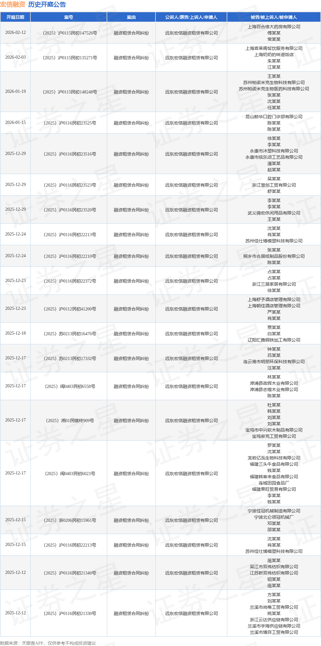 案号:(2025)苏0213民初16476号根据统计,近一年内以远东宏信融资租赁有限公司为当事人的历史开庭公告有145则,其中案由为“融资租赁合同纠纷”的公告以142则居首,其次为“租赁合同”有2则,“执行异议之诉”有1则。历史开庭公告(前20条)如下: