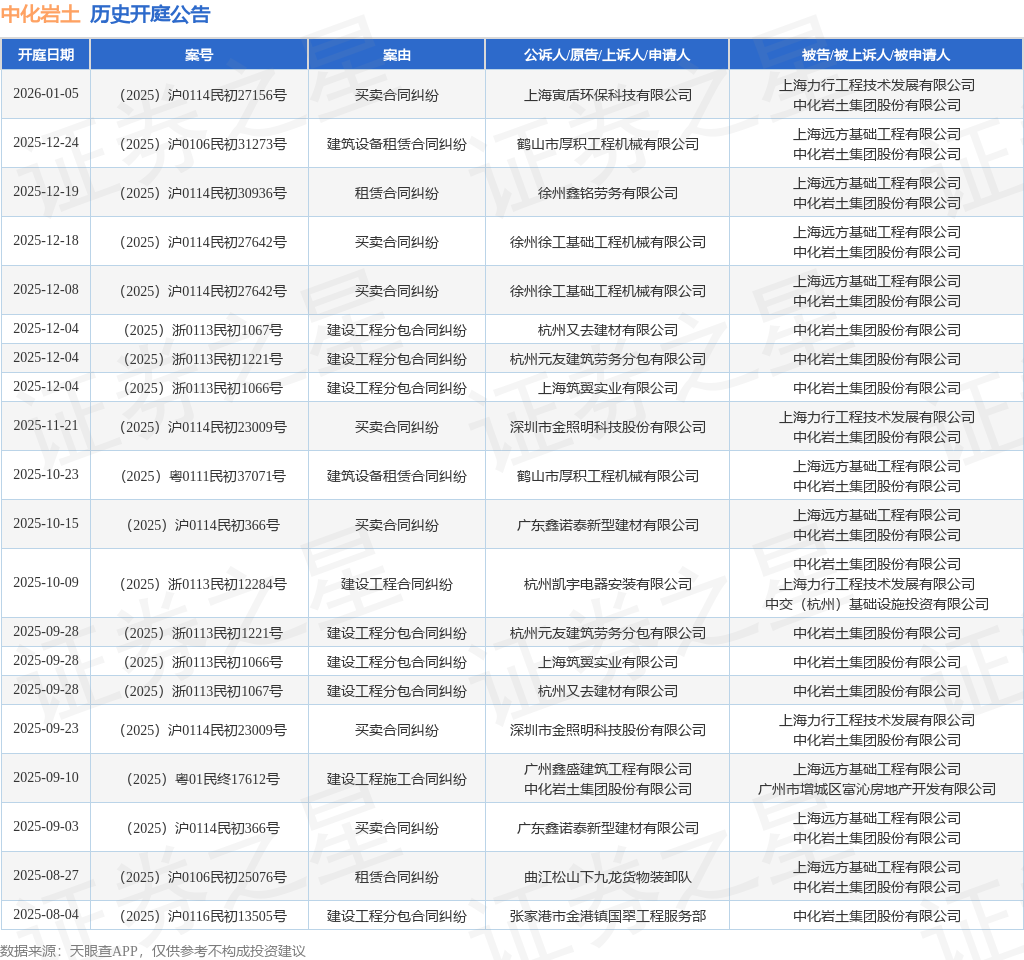 案号:(2025)沪0114民初27642号根据统计,近一年内以中化岩土集团股份有限公司为当事人的历史开庭公告有48则,其中案由为“买卖合同纠纷”的公告以12则居首,其次为“建设工程分包合同纠纷”有11则,“建设工程合同纠纷”有8则。历史开庭公告(前20条)如下: