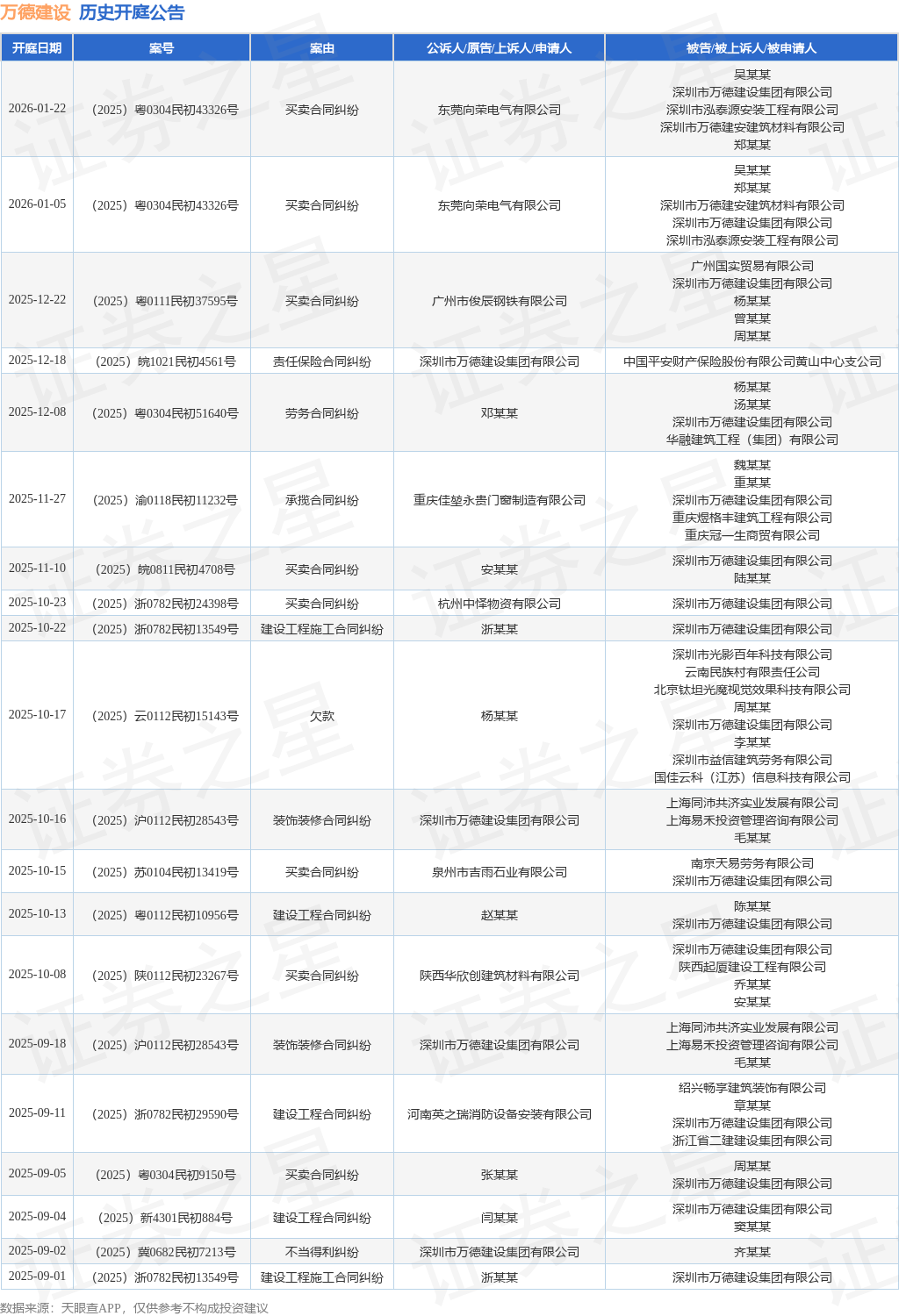 案号:(2025)皖1021民初4561号根据统计,近一年内以深圳市万德建设集团有限公司为当事人的历史开庭公告有89则,其中案由为“买卖合同纠纷”的公告以23则居首,其次为“建设工程施工合同纠纷”有14则,“建设工程合同纠纷”有11则。历史开庭公告(前20条)如下:
