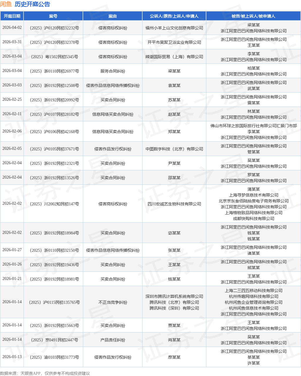 案号:(2025)粤1202民初12833号根据统计,近一年内以浙江阿里巴巴闲鱼网络科技有限公司为当事人的历史开庭公告有767则,其中案由为“信息网络买卖合同纠纷”的公告以141则居首,其次为“网络服务合同纠纷”有118则,“侵害商标权纠纷”有112则。历史开庭公告(前20条)如下: