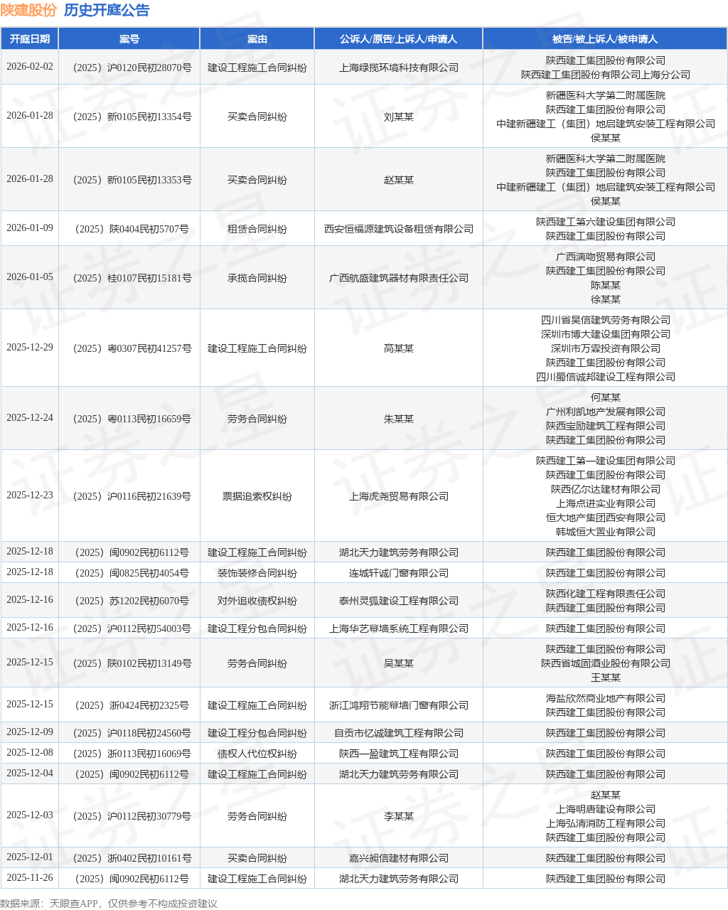 案号:(2025)闽0902民初6112号根据统计,近一年内以陕西建工集团股份有限公司为当事人的历史开庭公告有257则,其中案由为“建设工程施工合同纠纷”的公告以62则居首,其次为“买卖合同纠纷”有49则,“建设工程分包合同纠纷”有32则。历史开庭公告(前20条)如下: