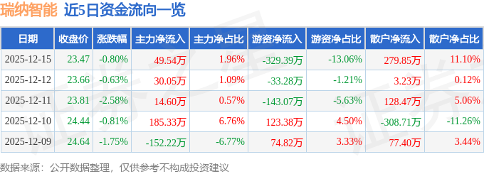 证券之星消息,截至2025年12月15日收盘,瑞纳智能(301129)报收于23.47元,下跌0.8%,换手率1.61%,成交量1.07万手,成交额2521.85万元。