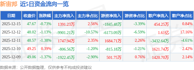 证券之星消息,截至2025年12月15日收盘,新宙邦(300037)报收于47.67元,下跌0.73%,换手率2.1%,成交量11.33万手,成交额5.44亿元。