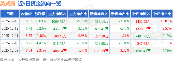 证券之星消息,截至2025年12月15日收盘,英威腾(002334)报收于8.67元,下跌0.69%,换手率1.71%,成交量12.56万手,成交额1.1亿元。