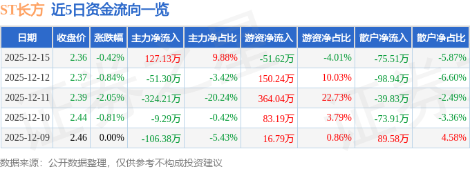 证券之星消息,截至2025年12月15日收盘,ST长方(300301)报收于2.36元,下跌0.42%,换手率0.69%,成交量5.43万手,成交额1286.24万元。