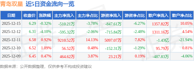 证券之星消息,截至2025年12月15日收盘,青岛双星(000599)报收于6.29元,下跌0.32%,换手率2.63%,成交量21.51万手,成交额1.35亿元。