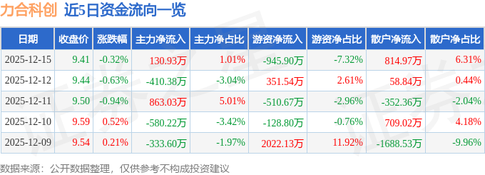证券之星消息,截至2025年12月15日收盘,力合科创(002243)报收于9.41元,下跌0.32%,换手率1.14%,成交量13.73万手,成交额1.29亿元。