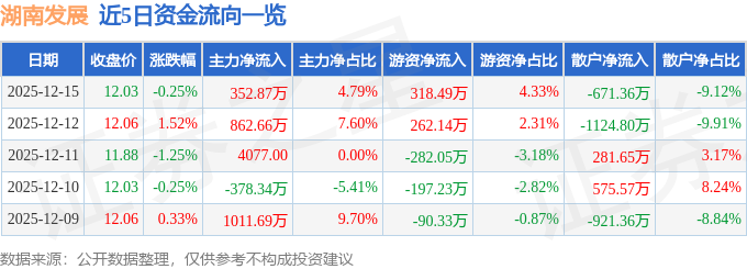 证券之星消息,截至2025年12月15日收盘,湖南发展(000722)报收于12.03元,下跌0.25%,换手率1.31%,成交量6.1万手,成交额7360.42万元。