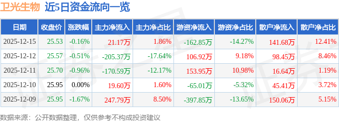 证券之星消息,截至2025年12月15日收盘,卫光生物(002880)报收于25.53元,下跌0.16%,换手率0.2%,成交量4474.0手,成交额1141.4万元。