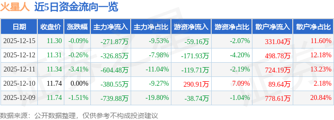 12月15日的资金流向数据方面,主力资金净流出271.87万元,占总成交额9.53%,游资资金净流出59.16万元,占总成交额2.07%,散户资金净流入331.04万元,占总成交额11.6%。
