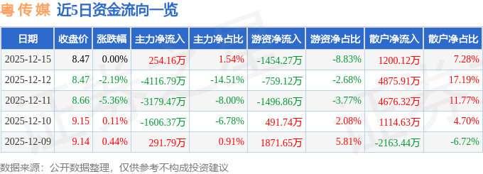 证券之星消息,截至2025年12月15日收盘,粤 传 媒(002181)报收于8.47元,上涨0.0%,换手率1.71%,成交量19.43万手,成交额1.65亿元。