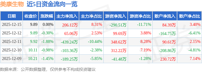 证券之星消息,截至2025年12月15日收盘,美康生物(300439)报收于9.89元,上涨0.0%,换手率0.86%,成交量2.52万手,成交额2480.34万元。