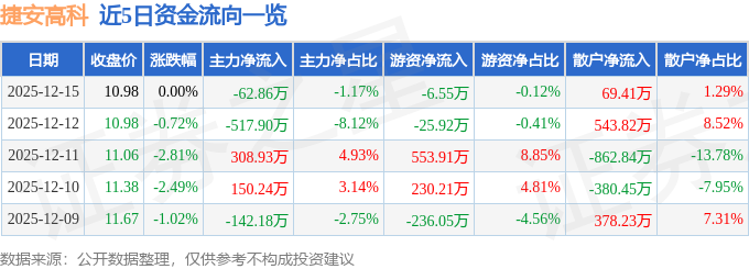 12月15日的资金流向数据方面,主力资金净流出62.86万元,占总成交额1.17%,游资资金净流出6.55万元,占总成交额0.12%,散户资金净流入69.41万元,占总成交额1.29%。