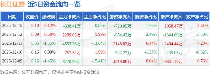 证券之星消息,截至2025年12月15日收盘,长江证券(000783)报收于8.1元,上涨0.12%,换手率0.9%,成交量49.88万手,成交额4.06亿元。
