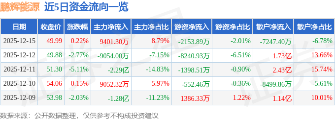 证券之星消息,截至2025年12月15日收盘,鹏辉能源(300438)报收于49.99元,上涨0.22%,换手率5.22%,成交量21.12万手,成交额10.69亿元。