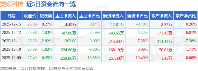 证券之星消息,截至2025年12月15日收盘,美硕科技(301295)报收于26.03元,上涨0.27%,换手率4.11%,成交量1.21万手,成交额3169.81万元。