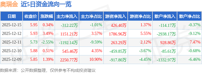 证券之星消息,截至2025年12月15日收盘,奥瑞金(002701)报收于5.95元,上涨0.34%,换手率2.01%,成交量51.48万手,成交额3.1亿元。
