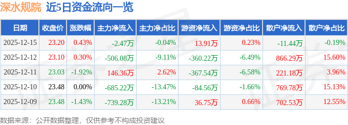 证券之星消息,截至2025年12月15日收盘,深水规院(301038)报收于23.2元,上涨0.43%,换手率1.14%,成交量2.54万手,成交额5928.93万元。