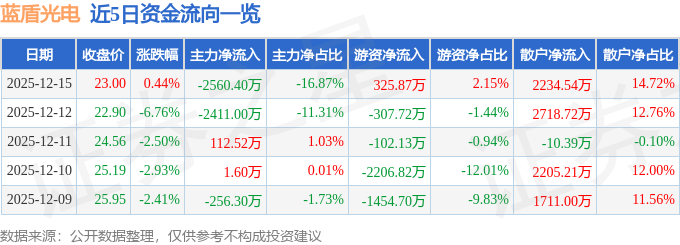 证券之星消息,截至2025年12月15日收盘,蓝盾光电(300862)报收于23.0元,上涨0.44%,换手率4.3%,成交量6.51万手,成交额1.52亿元。