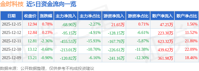 证券之星消息,截至2025年12月15日收盘,金时科技(002951)报收于12.94元,上涨0.78%,换手率0.58%,成交量2.34万手,成交额3028.97万元。