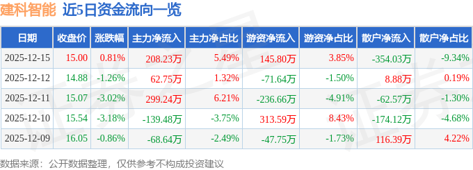 证券之星消息,截至2025年12月15日收盘,建科智能(300823)报收于15.0元,上涨0.81%,换手率2.99%,成交量2.53万手,成交额3791.23万元。