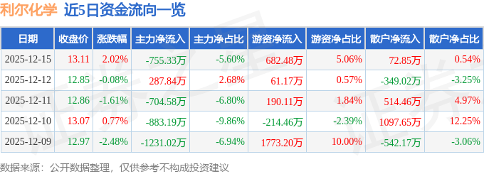 证券之星消息,截至2025年12月15日收盘,利尔化学(002258)报收于13.11元,上涨2.02%,换手率1.29%,成交量10.29万手,成交额1.35亿元。