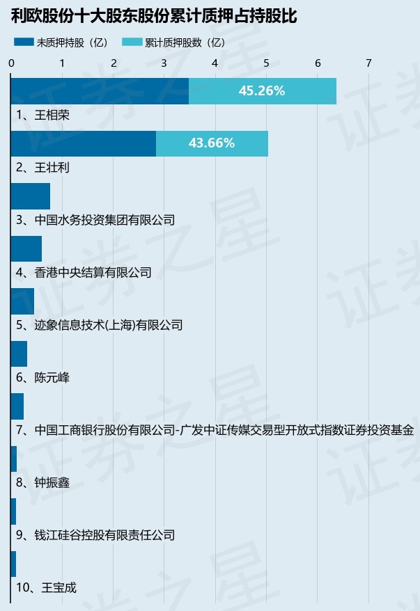 截止本公告日,股东王相荣已累计质押股份2.88亿股,占其持股总数的45.26%,股东王壮利已累计质押股份2.2亿股,占其持股总数的43.66%。本次质押后利欧股份十大股东的累计质押股份占持股比例(占持股比例的计算以公司最新一期财务报表公布的十大股东的持股总数为基准)见下图: