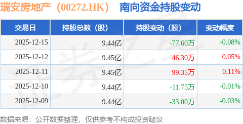 证券之星消息,12月15日南向资金减持77.6万股瑞安房地产(00272.HK)。近5个交易日中,获南向资金增持的有2天,累计净增持23.3万股。近20个交易日中,获南向资金增持的有9天,累计净增持365.4万股。截至目前,南向资金持有瑞安房地产(00272.HK)9.44亿股,占公司已发行普通股的11.76%。