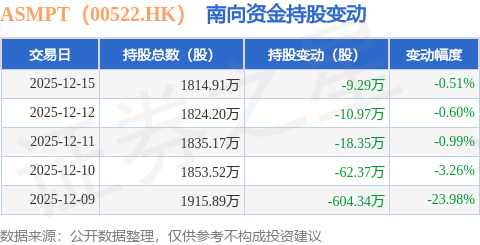 证券之星消息,12月15日南向资金减持9.29万股ASMPT(00522.HK)。近5个交易日中,获南向资金减持的有5天,累计净减持705.32万股。近20个交易日中,获南向资金减持的有12天,累计净减持759.1万股。截至目前,南向资金持有ASMPT(00522.HK)1814.91万股,占公司已发行普通股的4.33%。